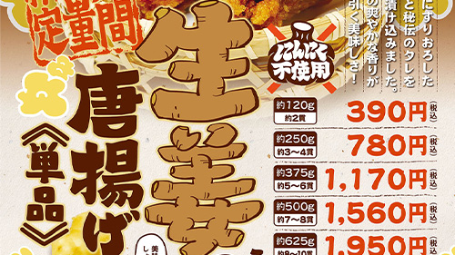 期間数量限定! 『生姜唐揚げ』が新登場! たっぷりの生姜と秘伝のタレにしっかり漬け込んだ、爽やかな香りが広がる唐揚げです! 【にんにく不使用】なので食後の予定を…